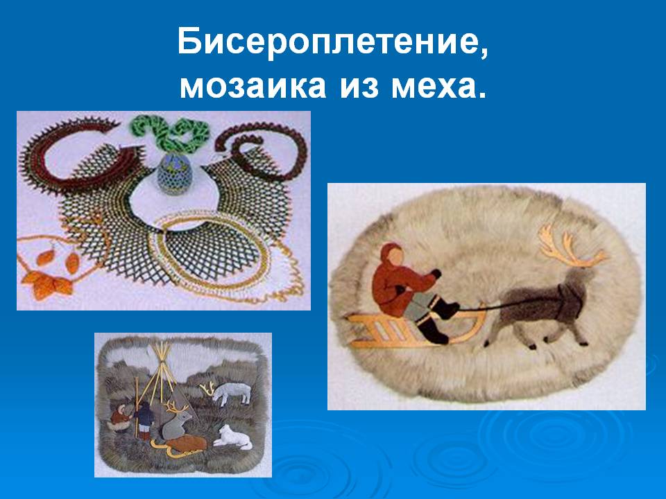 Меховая мозаика – изображение орнамента, выполненное из различных по цвету кусочков меха, сукна, ткани, соединённых между собой швом и создающих единый узор. Выполняются орнаментальные узоры на одежде и обуви из меха, на сумочках. Орнаменты, выполняемые по меху очень разнообразны.